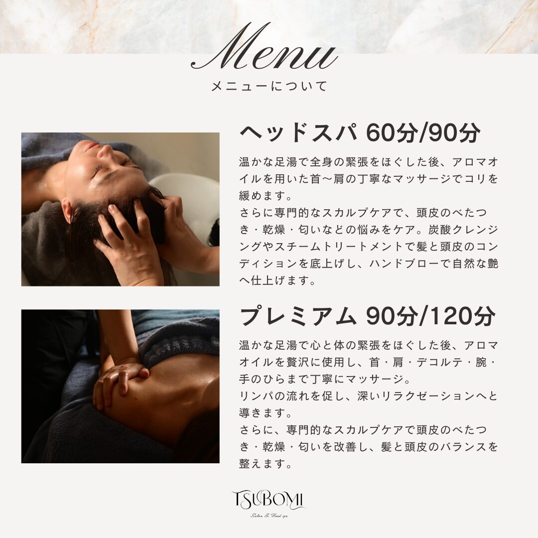 TSUBOMIがご提供する、 たっぷり120分のプレミアムヘッドスパでは、頭皮を中心に首・肩まわりまで丁寧にアプローチし、日々の疲れや緊張をゆっくりと解きほぐしていきます。 施術後には、KTケラチントリートメントを行い、ダメージやエイジングによって変化した髪を内側から補修。髪の主成分であるケラチンを補いながら、 頭皮をしっかりほぐした後にトリートメントを行うことで、仕上がりのなめらかさや、自然なツヤ感をより感じていただきやすいのも特徴です。 「心も体もゆるみ、髪まできれいになる」 ご自身へのご褒美としてはもちろん、お誕生日や記念日、年末年始の贈り物など、大切な方へ“上質な癒しの時間”を贈るギフトとしてもおすすめです。 チケット内容・プレミアムヘッドスパ 120分 |
